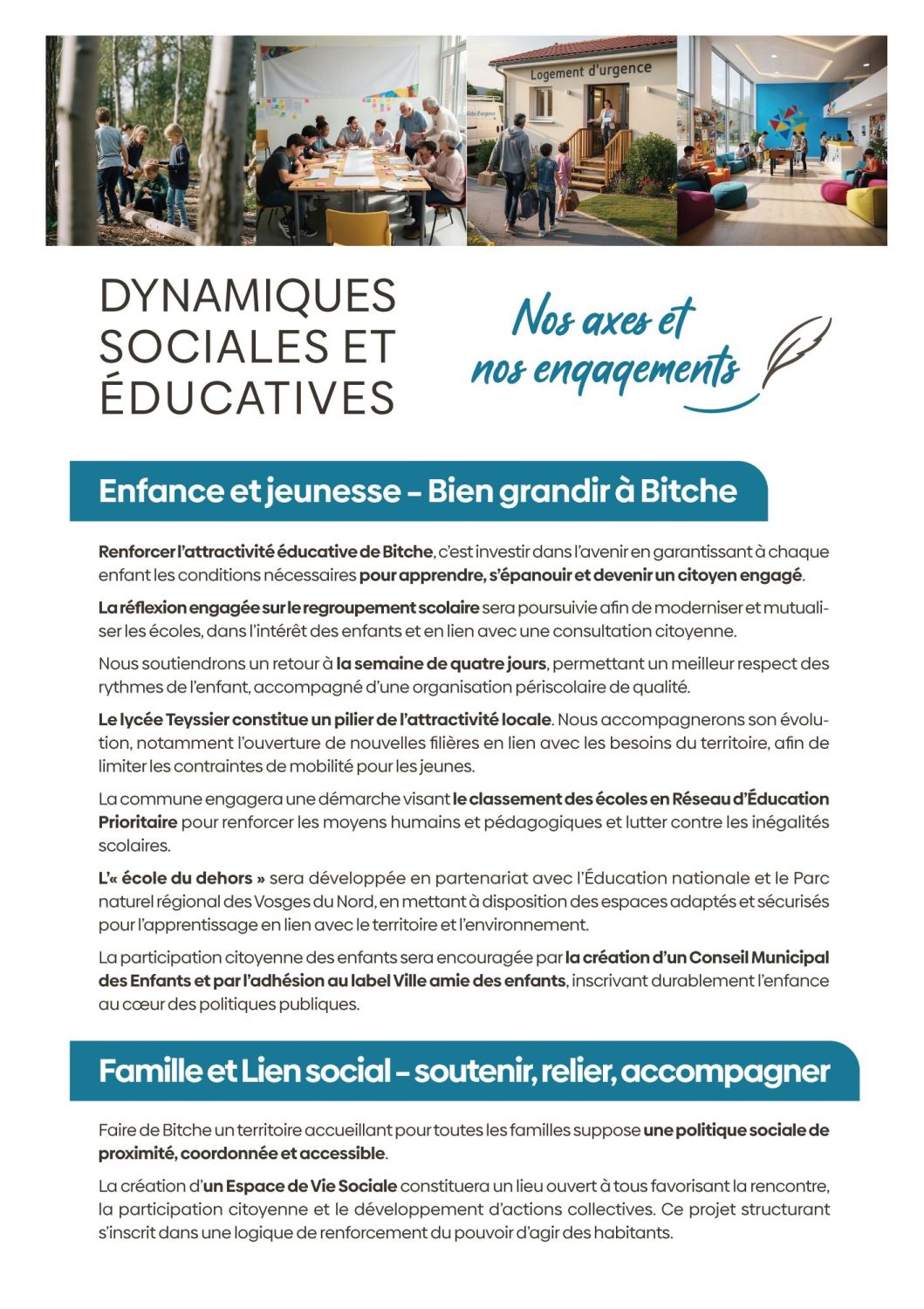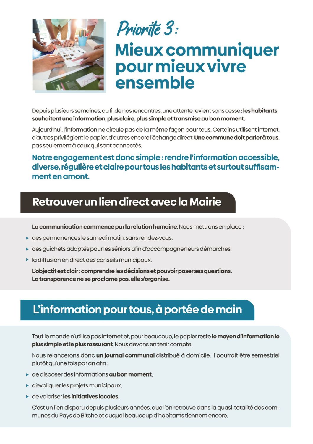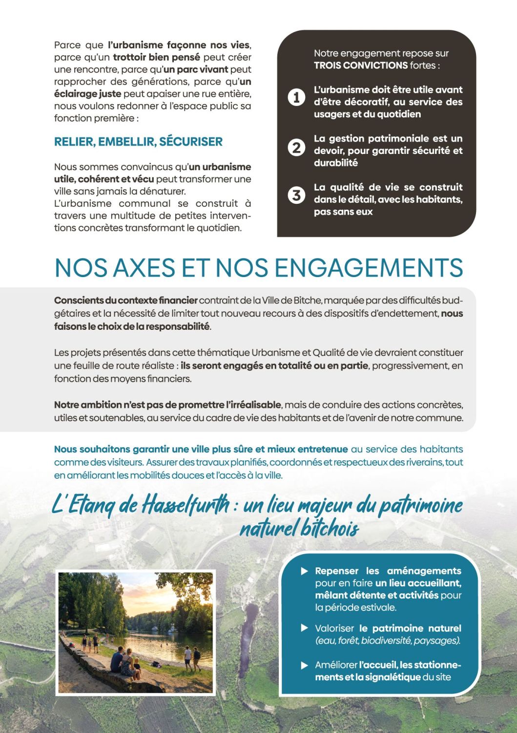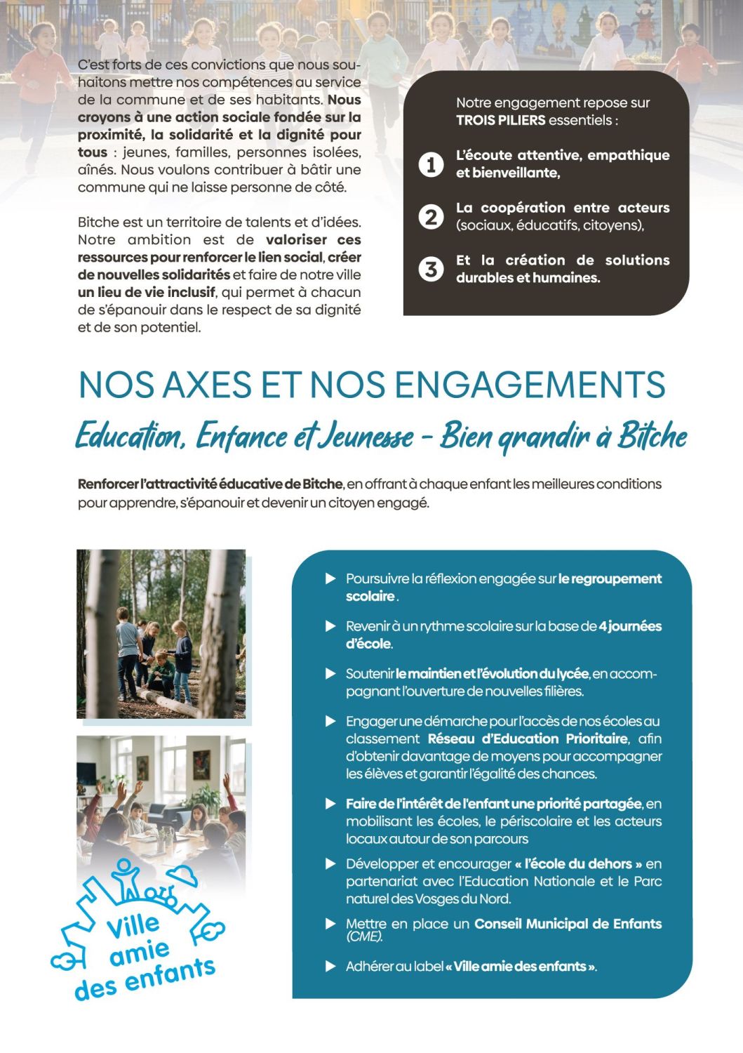 Aujourd’hui, cette démarche s’ouvre à vous. Nous venons à votre rencontre pour vous écouter, recueillir vos idées, vos attentes, vos priorités. Parce qu’un projet municipal ne se décide pas seul. Il se construit avec celles et ceux qui vivent la ville au quotidien. Je souhaite pour Bitche un souffle nouveau : une manière plus simple, plus ouverte, plus participative de faire de la politique locale. Une politique concrète, proche, humaine.