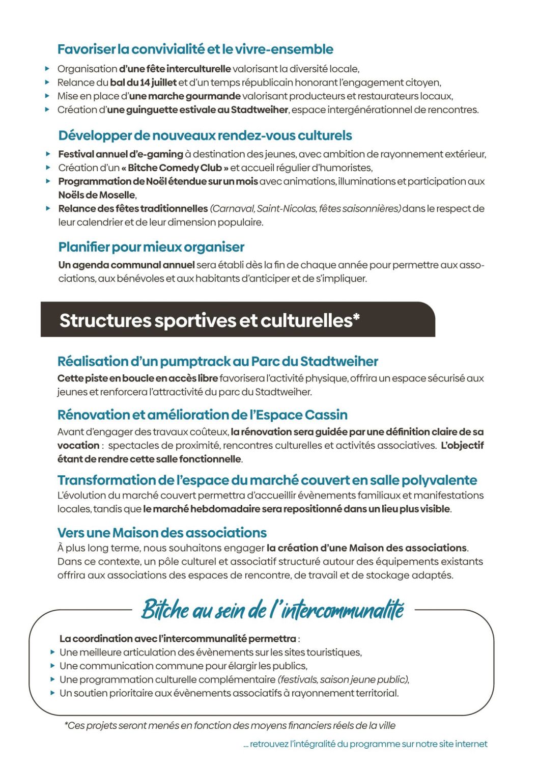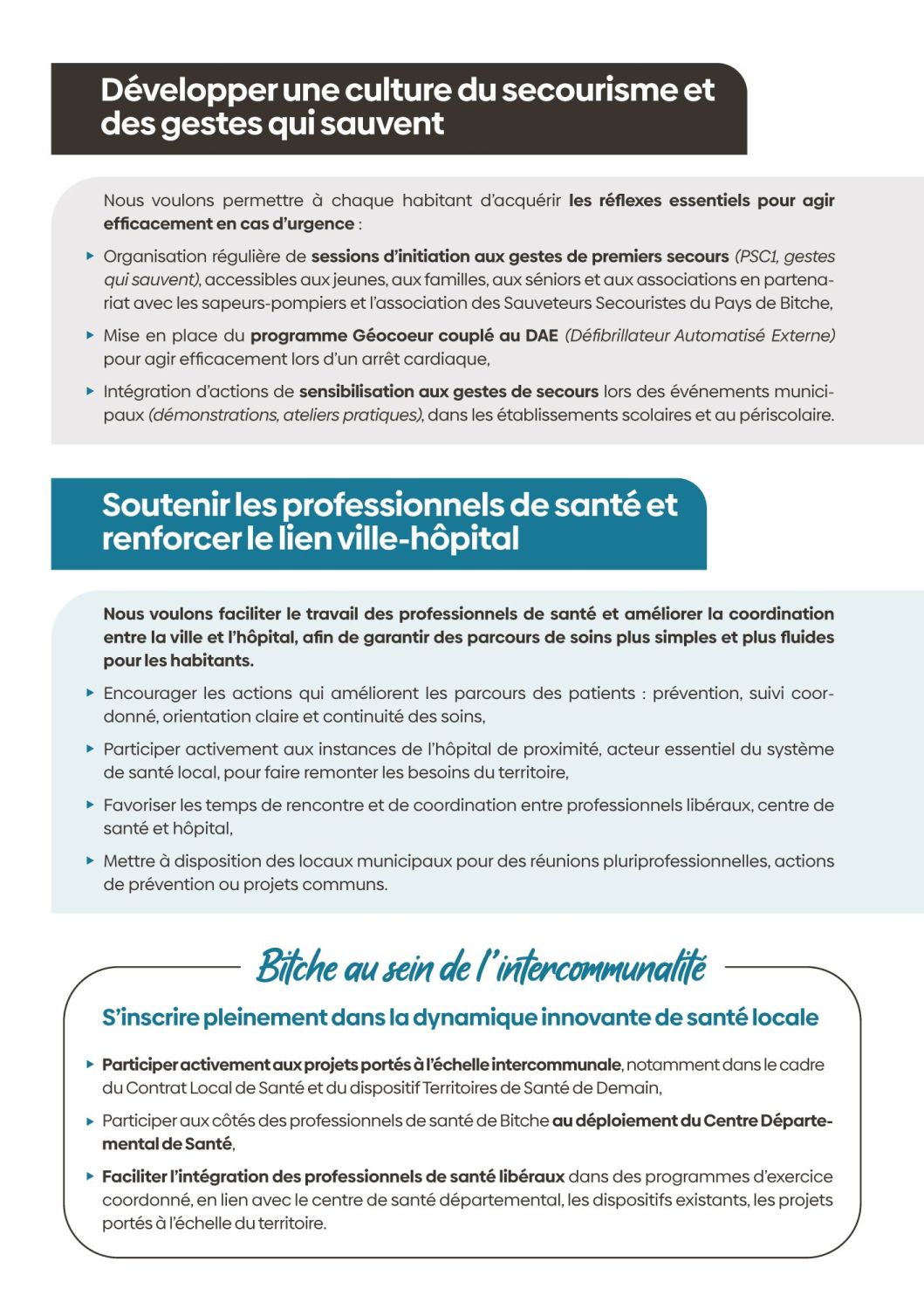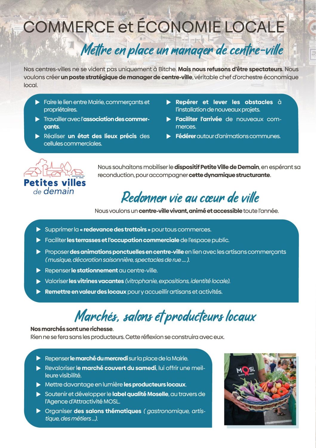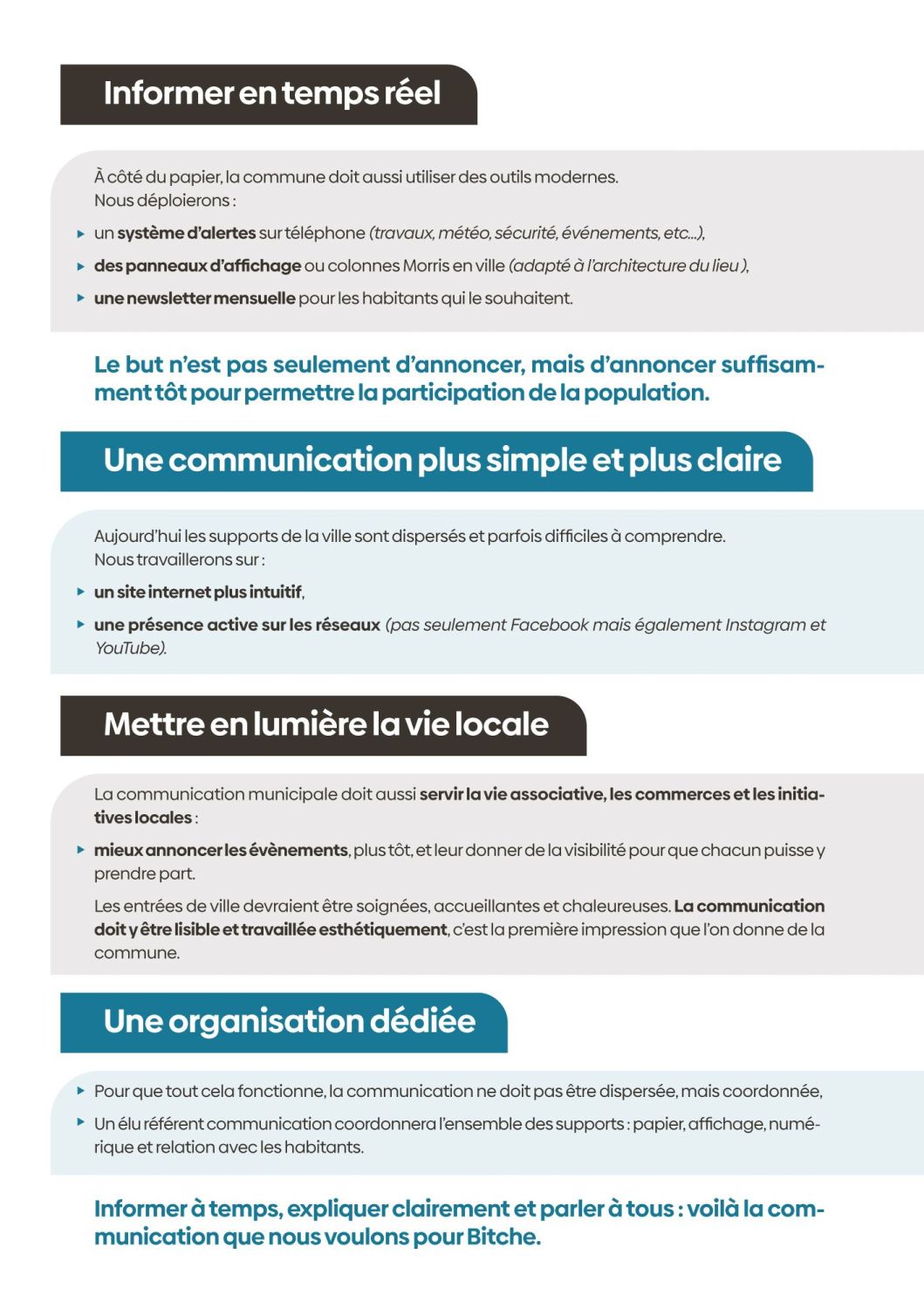 Aujourd’hui, cette démarche s’ouvre à vous. Nous venons à votre rencontre pour vous écouter, recueillir vos idées, vos attentes, vos priorités. Parce qu’un projet municipal ne se décide pas seul. Il se construit avec celles et ceux qui vivent la ville au quotidien. Je souhaite pour Bitche un souffle nouveau : une manière plus simple, plus ouverte, plus participative de faire de la politique locale. Une politique concrète, proche, humaine.