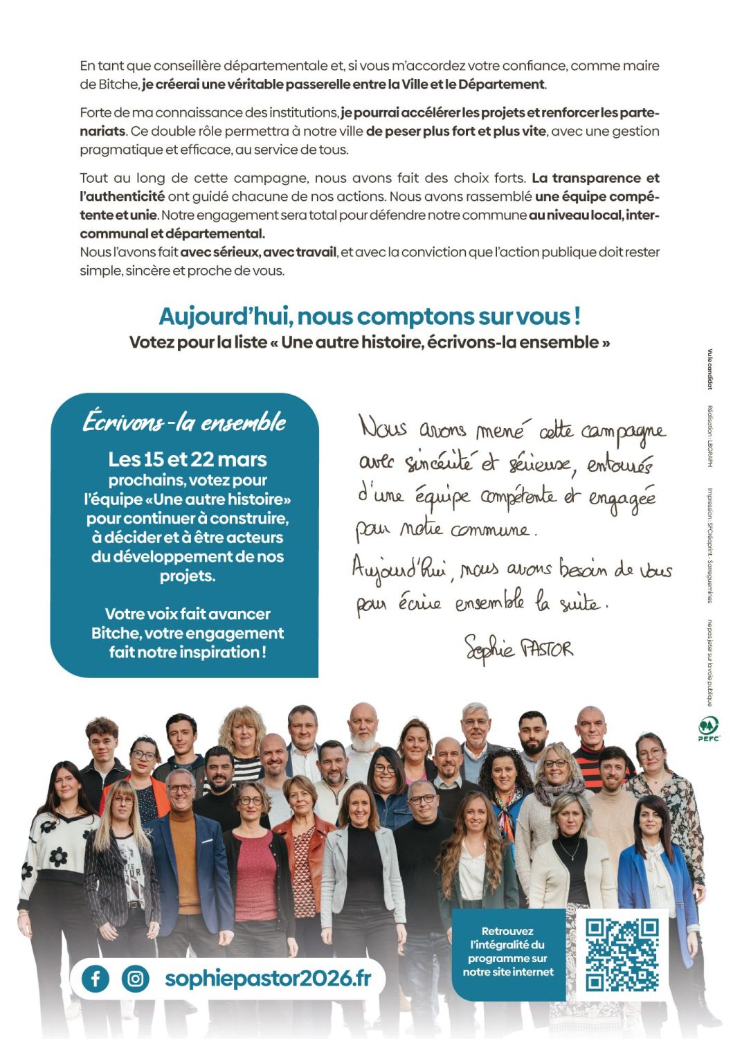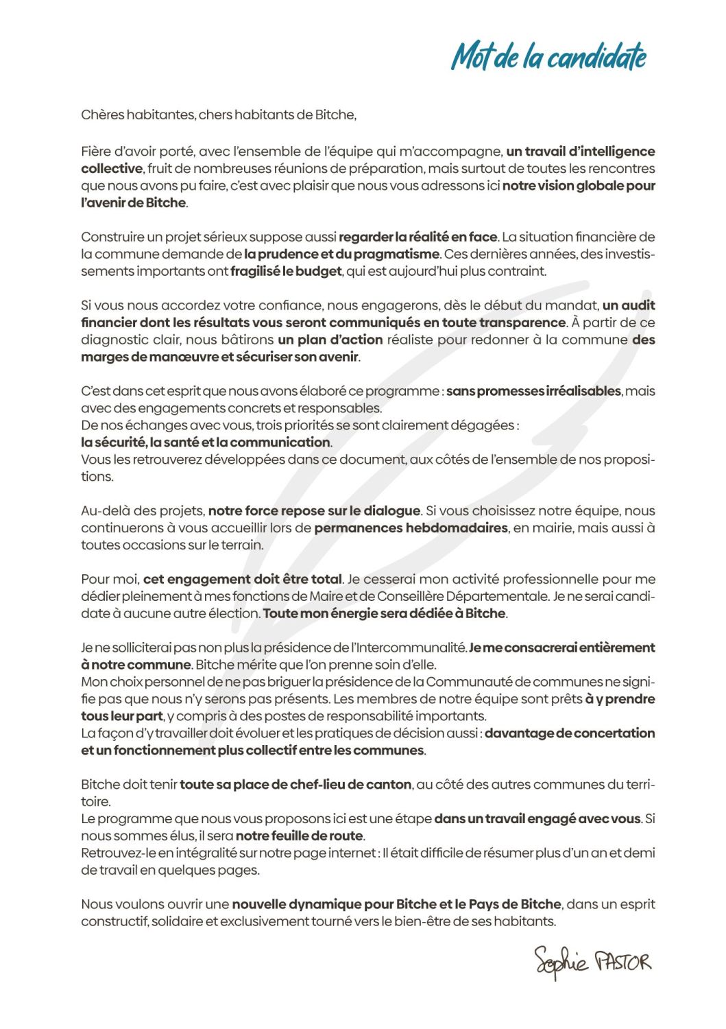 Je m’appelle Sophie PASTOR, j’ai 47 ans, je suis née à Bitche. J’y ai grandi, j’y ai mes racines. Ce sont des visages, des souvenirs, une histoire personnelle, avec mes enfants, qui me lient profondément à ses habitants. Cet attachement n’est pas un slogan : il est le point de départ de mon engagement.
